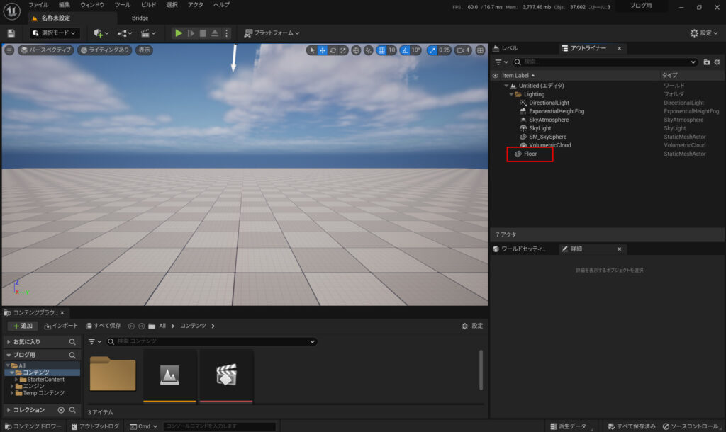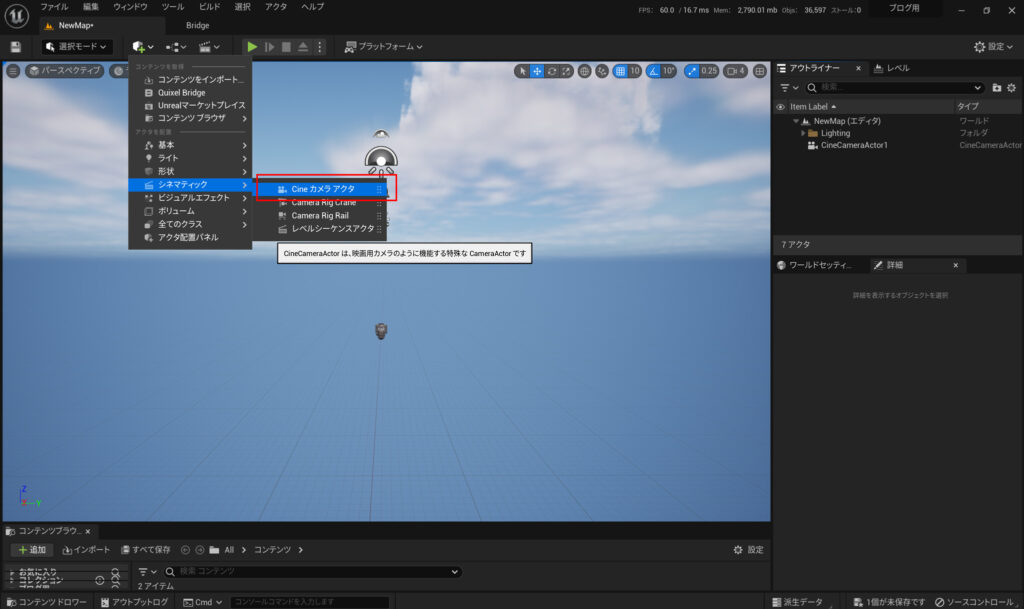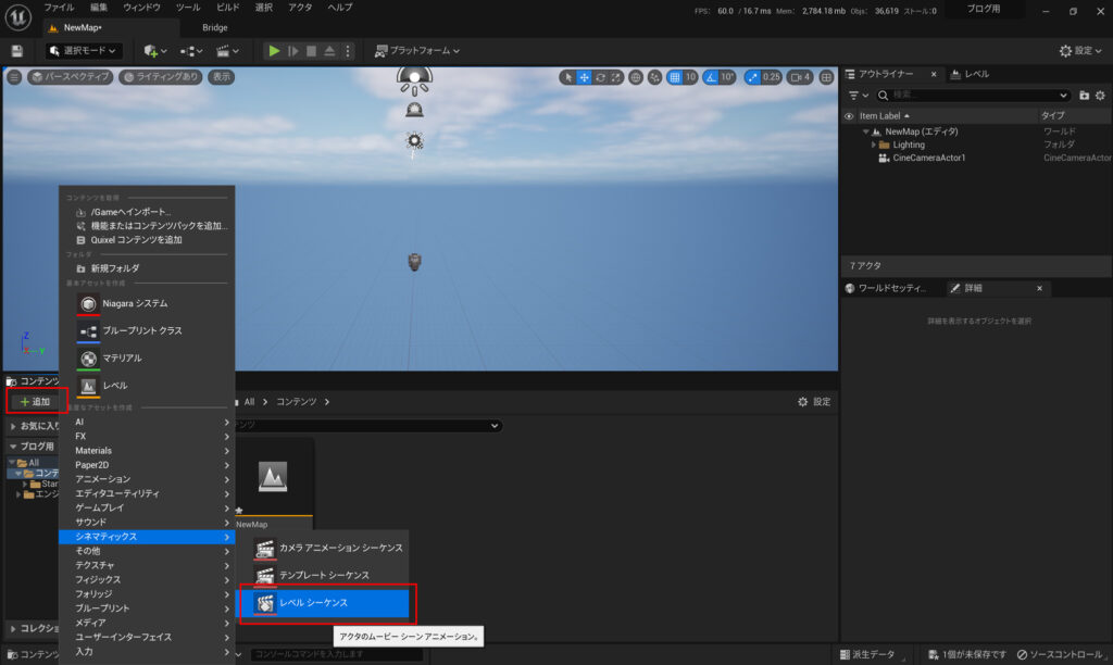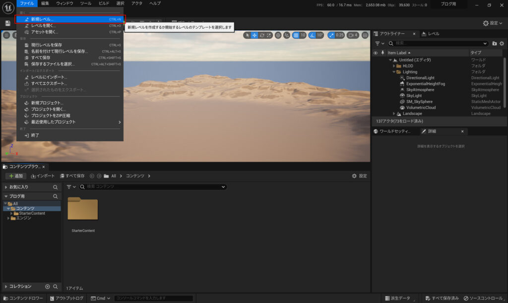 起動後、「ファイル」→「新規レベル」で新しいシーンを作成します。
