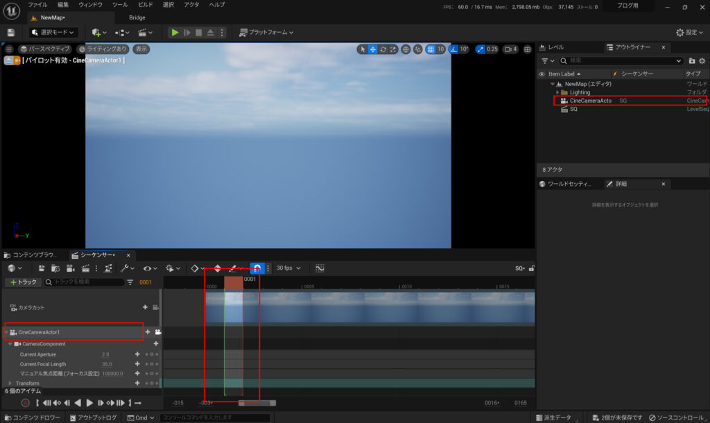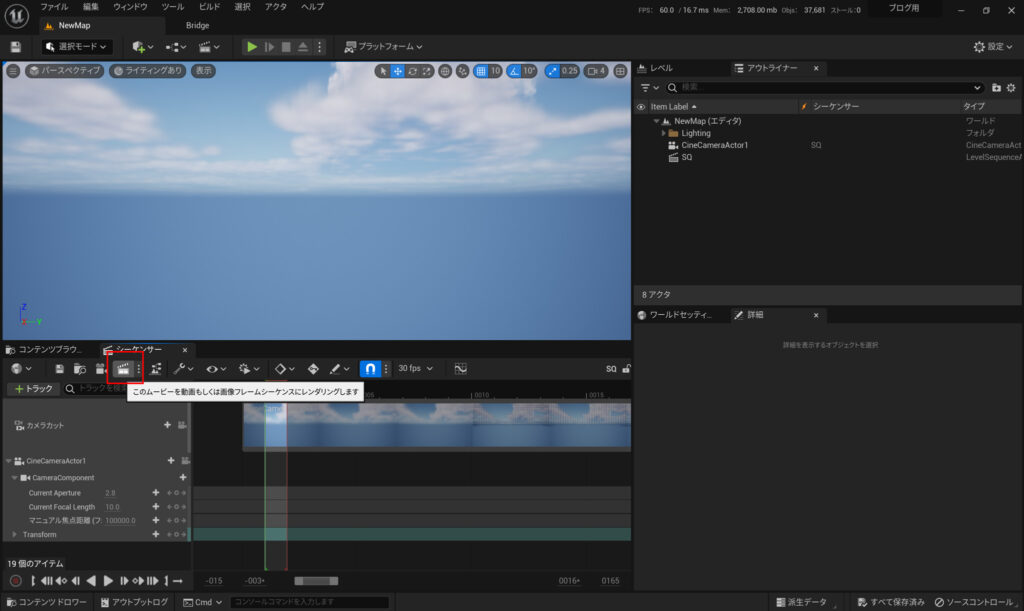 作成した「レベル シーケンサ」ファイルをダブルクリックして、シーケンサタブを起動します。緑と赤のラインで、出力するフレーム数の調整します。今回は1フレームで良いので、1フレーム分の領域に設定します。