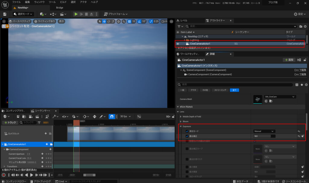 うまく撮影できない場合もあるので、カメラの調整をします。カメラを選択して、「Lens」→「Exposure」→「測光モード」→「Manual」、「露出補正」→「10程度」。