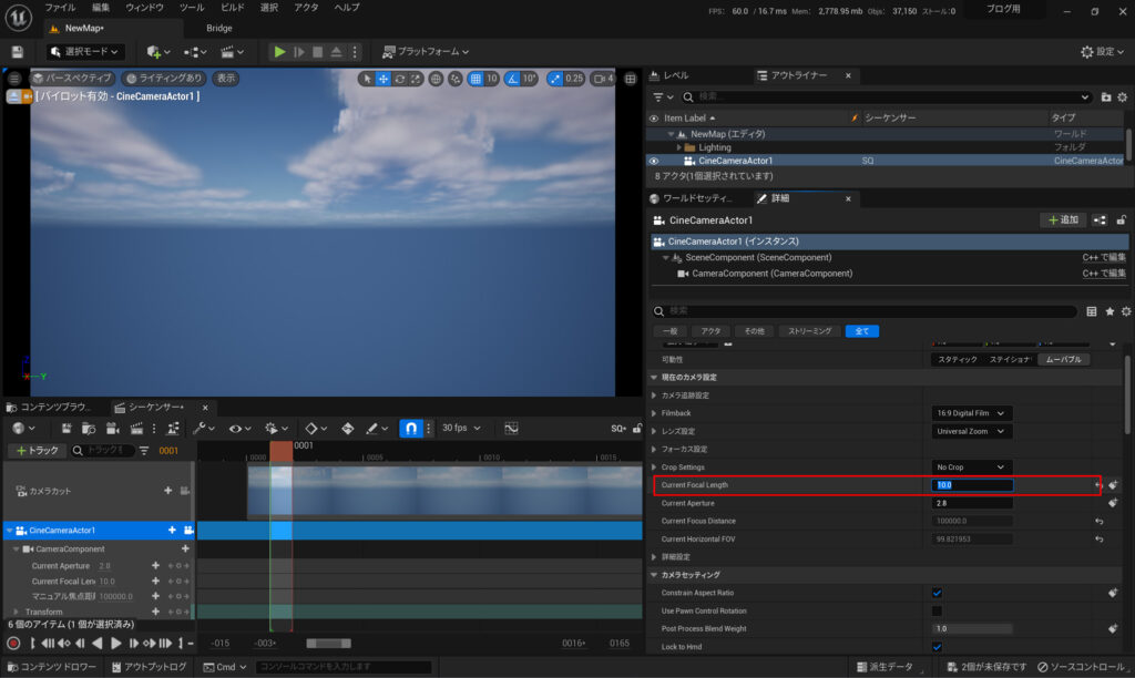 「現在のカメラ設定」→「Current Focal Length」→「10程度」で画角を広くします。