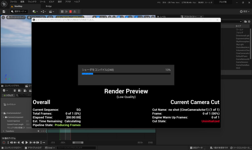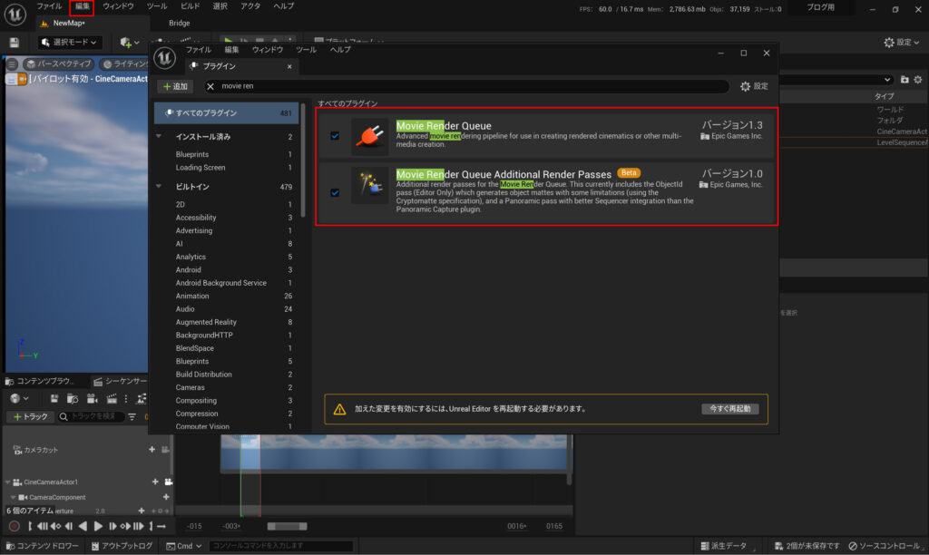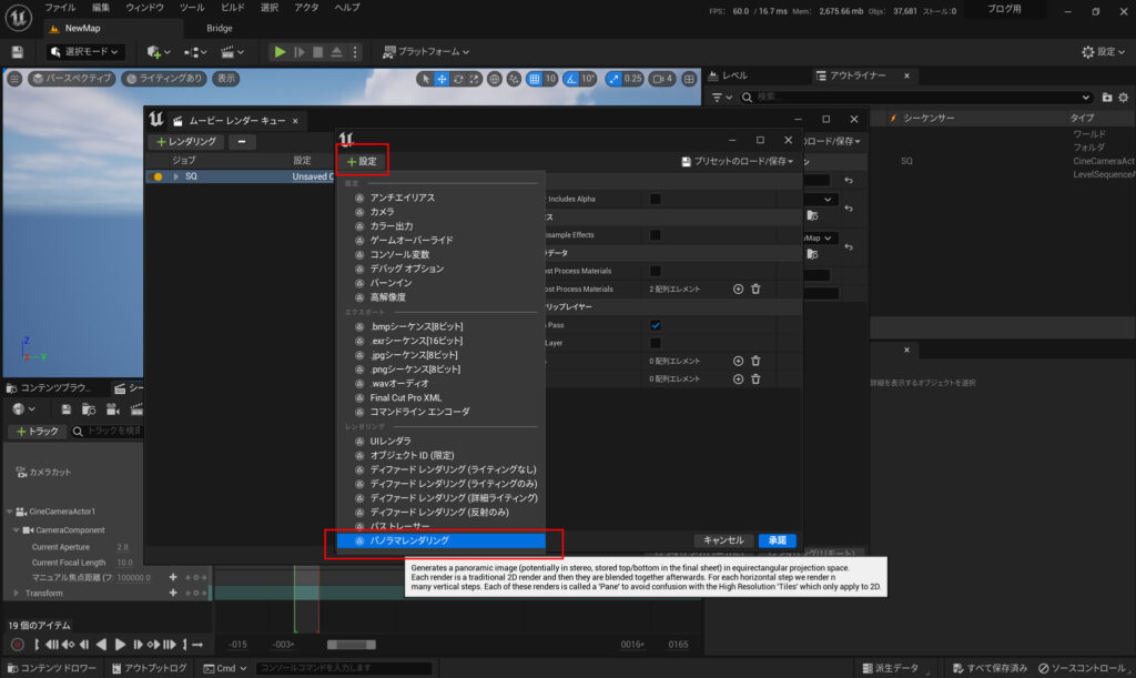 360度を画像用にプラグインをインストールします。「Movie Render Queue」「Movie Queue Additional Render Passes」にチェックして、再起動します。