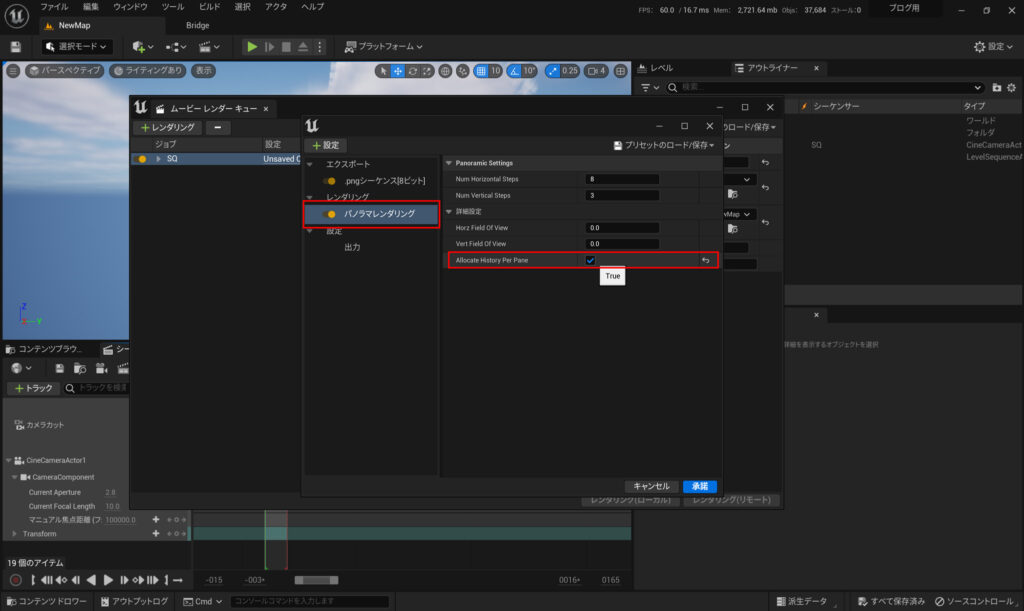 「ディファードレンダリング」の項目を削除して、「パノラマレンダリング」→「AlloCate Histroy Par Pane」にチェックを入れる。そのほか、「Pngシーケンス」に設定します。