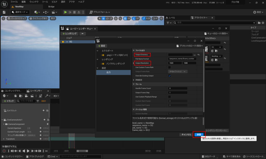 「出力」から、ファイルの保存先、画角サイズを設定して、「承認」します。