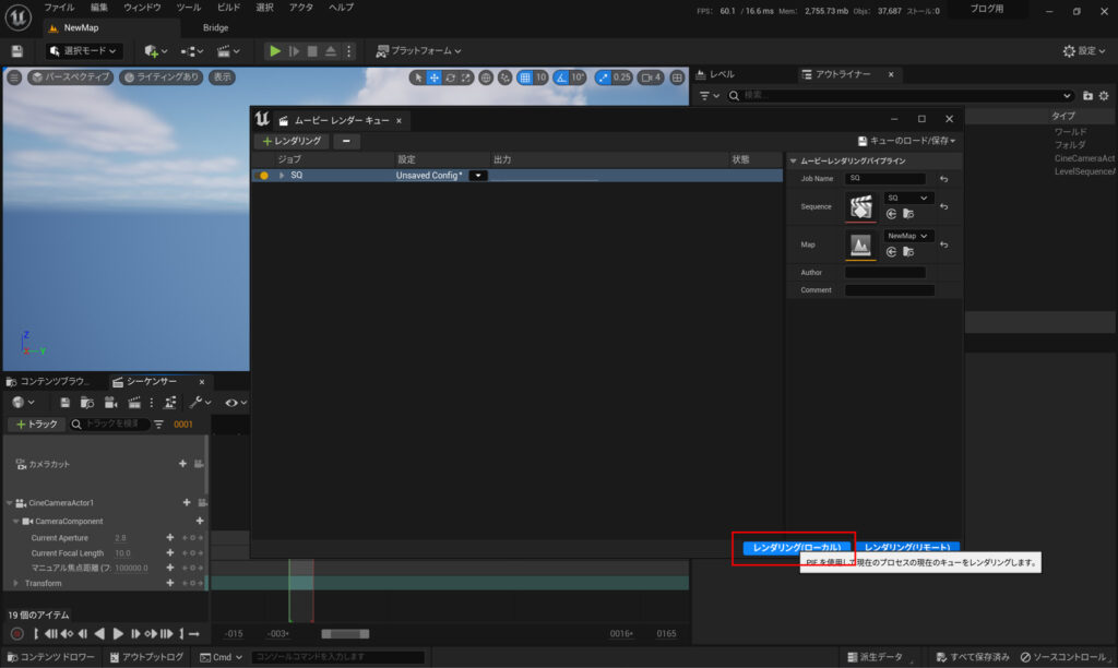 「レンダリング(ローカル)」で出力します。クリック前に保存することをおすすめします。
