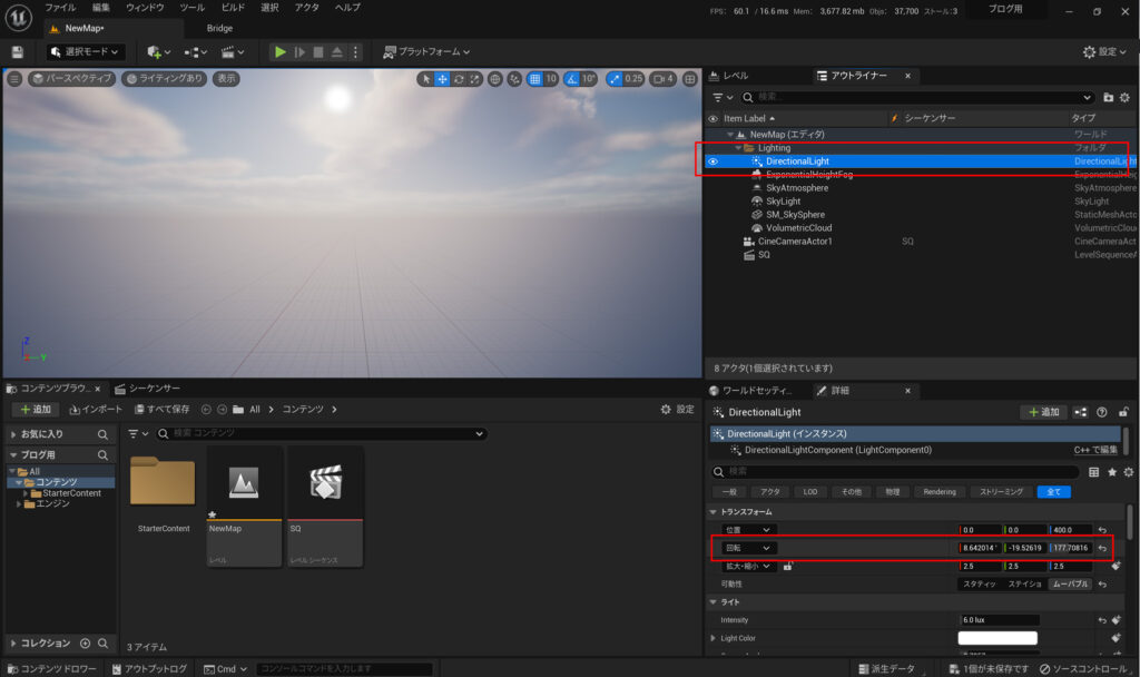 空模様の設定は、Lightinigフォルダから調整できます。回転を変えることで、太陽の位置を変更できます(ctrl+L)。