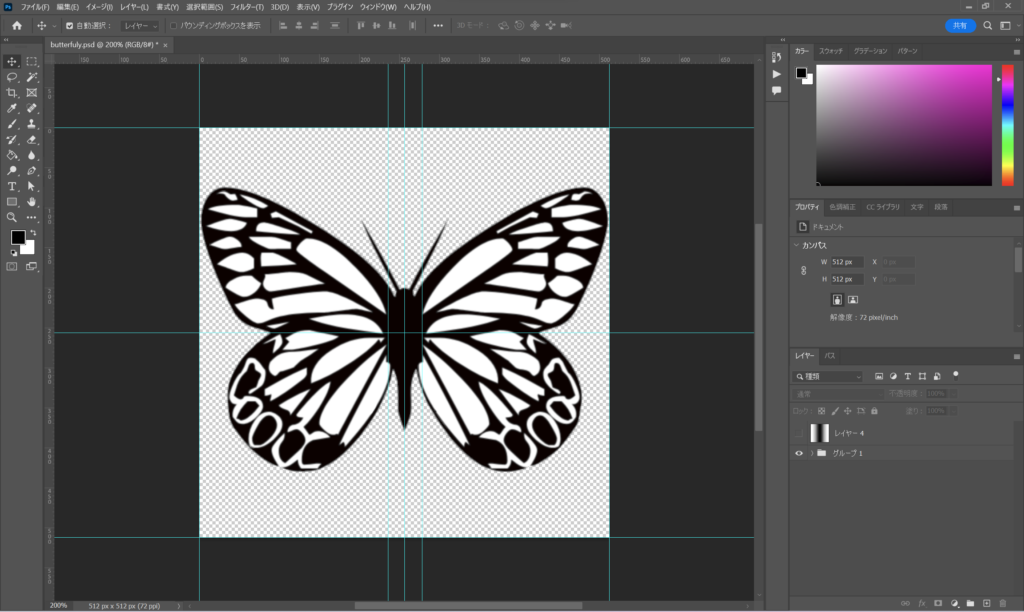 以下のように512×512で画像を2枚作成します(butterfly.png、gradation.png)。グラデーション素材はshaderで羽ばたき用に使用します。蝶のカラーはshader側で設定します。白の部分にカラーが乗るイメージです。shader側で設定しない場合は、この時点で色を載せてOKです。
